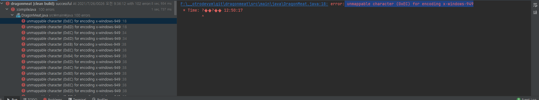 intellij에서의 java compile하면서 인코딩이 949로 되어 있어서 발생하는 에러였습니다..
