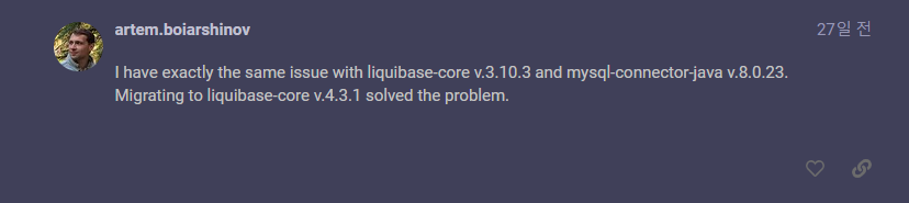 Spring이 아닌 mysql-connector-java v.8.0.23과 liquibase-core v.3.10.3에서 발생하는 문제이고 버전을 liquibase-core v.4.3.1로 변경하면 해결할 수 있다고 합니다.