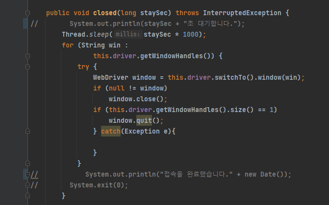 소스상에서는 finally로 항상 마지막에 driver를 닫아주게끔 변경했습니다.